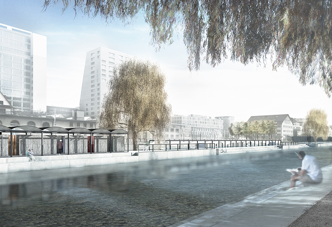 Für das Baden am Fluss existieren gegenwärtig zwei Schwierigkeiten - zum Einen variiert der Wasserpegel durchschnittlich 70 cm im Jahr, statistisch steigt er alle 5-10 Jahre sogar um 1,50m an. Zum Anderen ist der Fluss erst ab der Flussmitte aufgrund eines niedrigen Querschnitts schwimmbar. Ein Bad inmitten des Fluss wird daher vorgeschlagen, das die Zweiseitigkeit des Ortes in sich aufnimmt und die konträren Quartiere vermittelt. Ein langer Weg über das Wasser verbindet den Ampèresteg mit einer neuen Flussquerung für Fussgänger am Escher-Wyssplatz. Die Flusstreppe erhält ein Gegenüber, unterschiedlicher Treppen zum Verweilen am und über dem Wasser. Zur schwimmbaren Seite des Escher-Wyss-Platz bietet ein schwimmbarer Steg Liegefläche immer direkt an der Wasseroberfläche. Stoffrollen und Hängematten können im Kiosk ausgeliehen werden, sodass der Steg zusätzliche Liegefläche sowie variablen Sonnen- und Sichtschutz bieten kann. Umkleiden sowie Kiosk und Sanitätszimmer gliedern sich unter einer leichten Stahlkonstruktion, die in seiner Serialität durch farbige Stoffe, Schliessfächer und Solarglaselemente variiert wird.